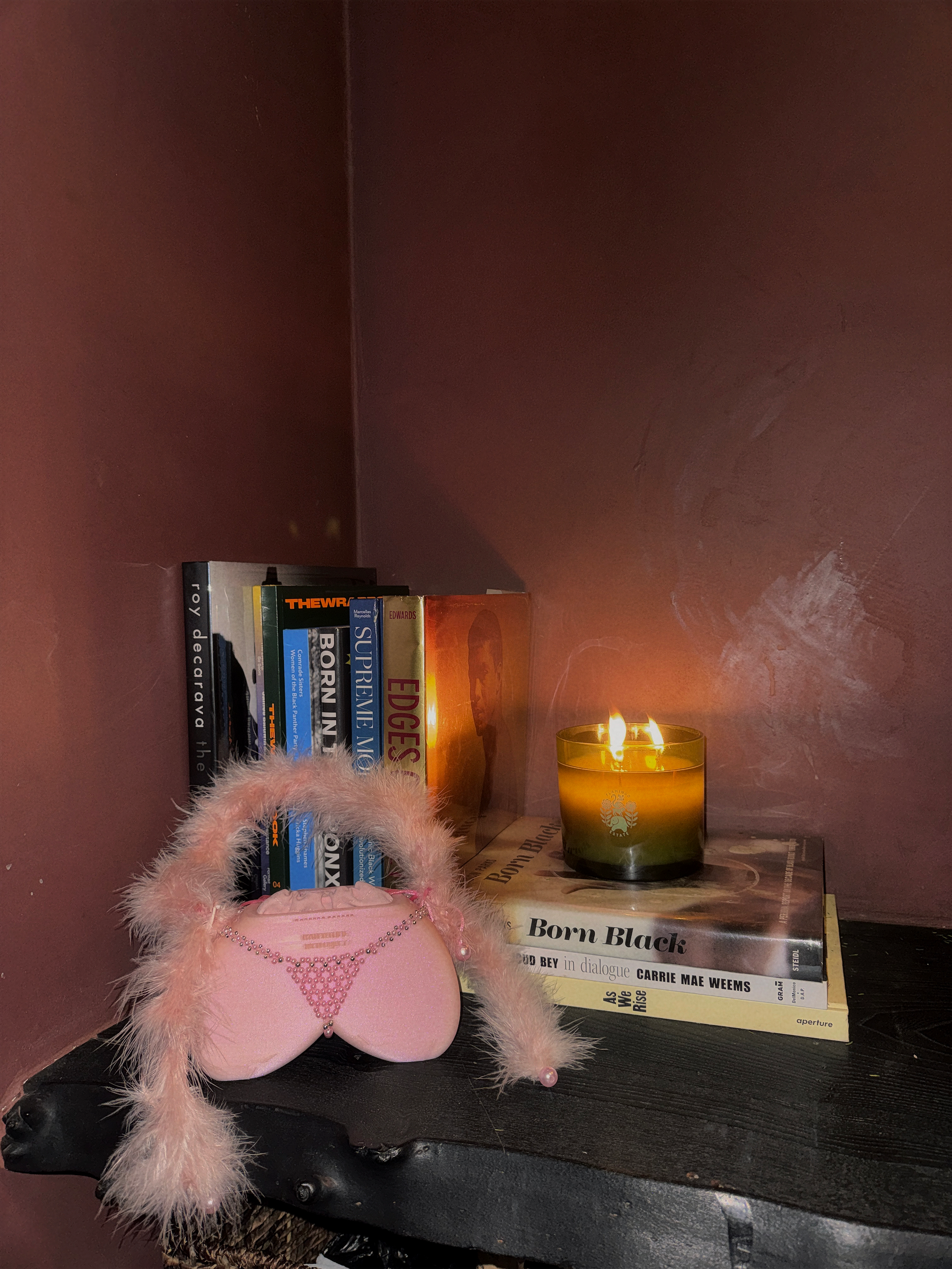 Every piece features a pink velvet drawstring interior lining, a light pink hand-beaded pearl G-string, and a marabou feather handle accented with soft pink pearls. Each element is assembled and finished by hand, resulting in a delicate yet deliberate balance of texture, softness, and structure.